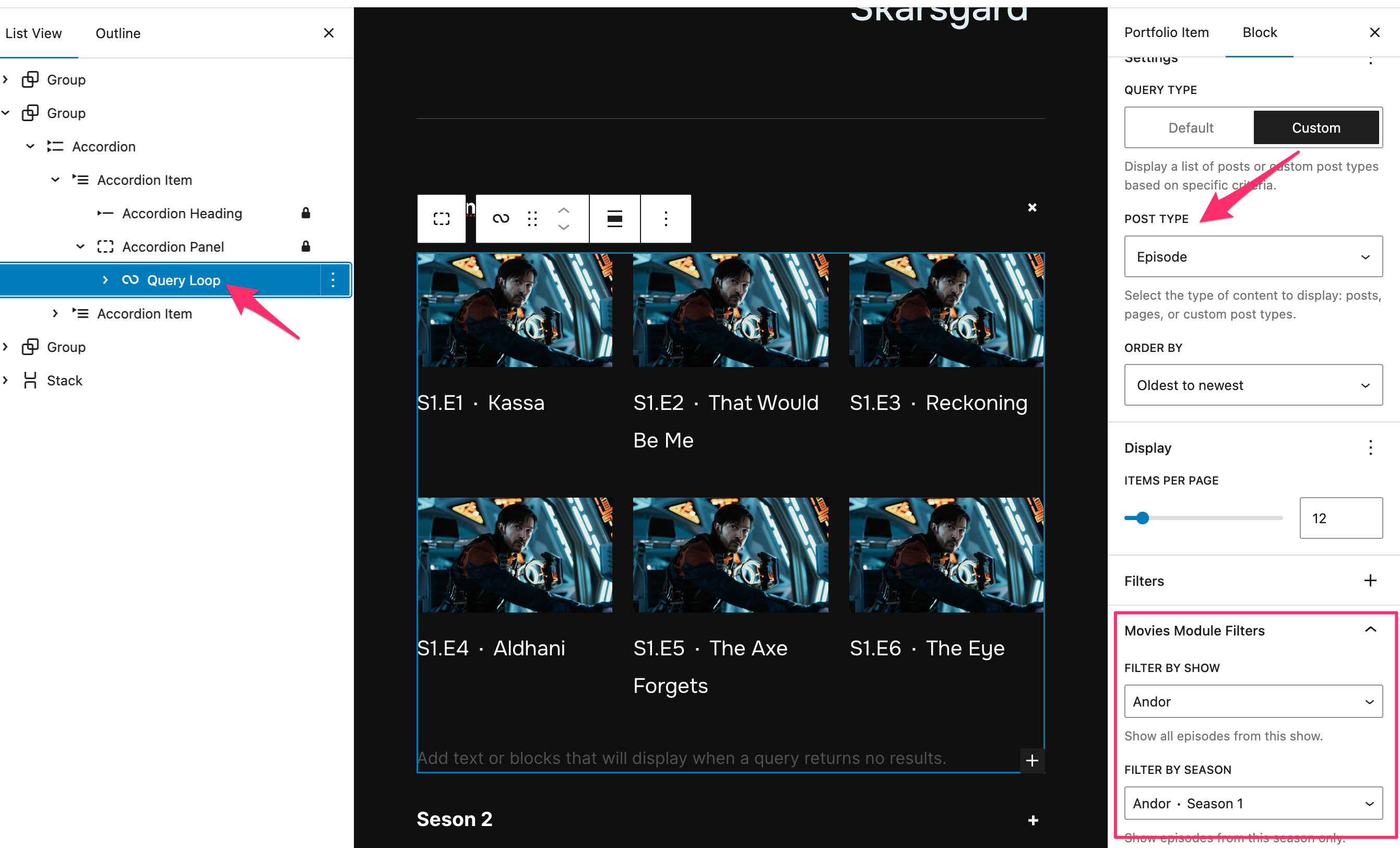 You can display episodes from specific shows or seasons anywhere on your site. Want to feature the latest three episodes from a particular show on your homepage? Or create a page that lists all episodes from one season? The module adds filters that let you do this through the WordPress block editor without writing code.